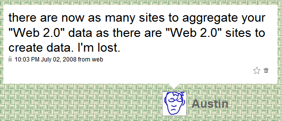 So one night I'm sitting around getting totally annoyed with the various different places where you can pull your stuff all together. You can do it with FriendFeed, Soup.io, Socialthing, Plaxo, Profilactic, and even Tumblr. There are countless others I'm sure that I'm missing or just don't care about. And all of these sites seem to all home something in common besides bring all of your data together... they want you to be friends with people. It doesn't matter that I've had to make sure I'm friends with all my friends on all the sites they are aggregating. I also have to be friends with my friends on the aggregation sites too. I'm tired of being friendly